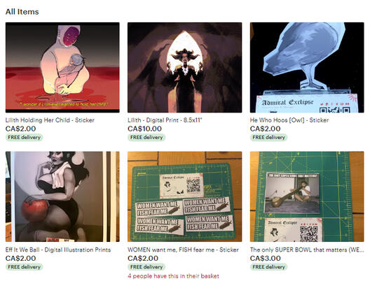 On Etsy I'm able to sell my art prints and stickers, each order comes by snail mail with no tracking, but for you this means free shipping !-Etsy.com/shop/AdmiralExclipse-If you would like to request a listing, do not hesitate to contact for further information.