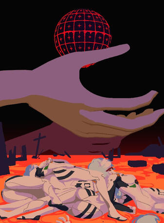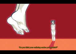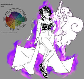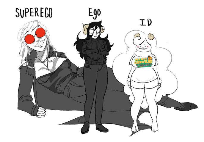 Superego and ID.ID, a rounded, cartoonish figure with the body type of my own who is symbolic of myself in many ways. ID is visually coded much like a human woman, but her horns signify she is a ram. I myself am intersex, and find this to be the most comfortable way of expressing the way in which my sex correlates to my gender. ID is my worst impulses and my deepest devotions. ID also represents my experience as a survivor of childhood abuse, in where I felt like a frail sacrificial lamb while young, and in adulthood I am a ram who remembers the rituals.Superego is a haunting figure, pale, eyes obscured by large red circle shades. she represents the ways in how I dress to attempt to fit in as a woman, a souless smile and never seemingly in scale of the rest of the crowd. Superego is logical, superego is moral, superego is the overseer. (see what im getting at?), superego represented both my wit, tact, talent, but also parrots the cruel "logic" of my former abusers. so often the superego can become loud. overbearing.